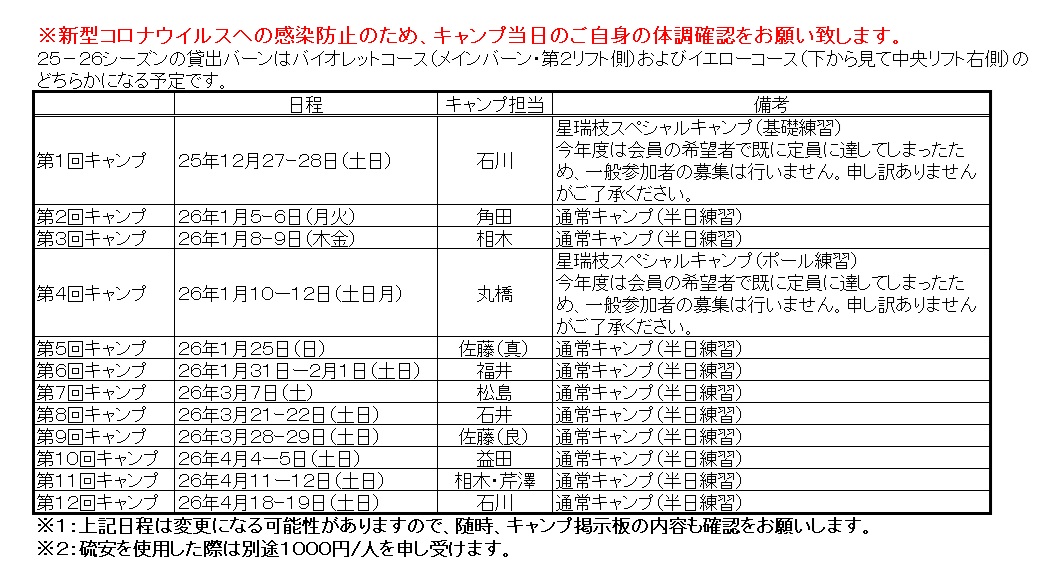 25年11月22日時点の日程です。 また、開催週の水曜日の午後10時の時点で参加者が8名に満たない場合はキャンプ担当の判断で開催中止することもあります。 参加表明は早めにお願いいたします。